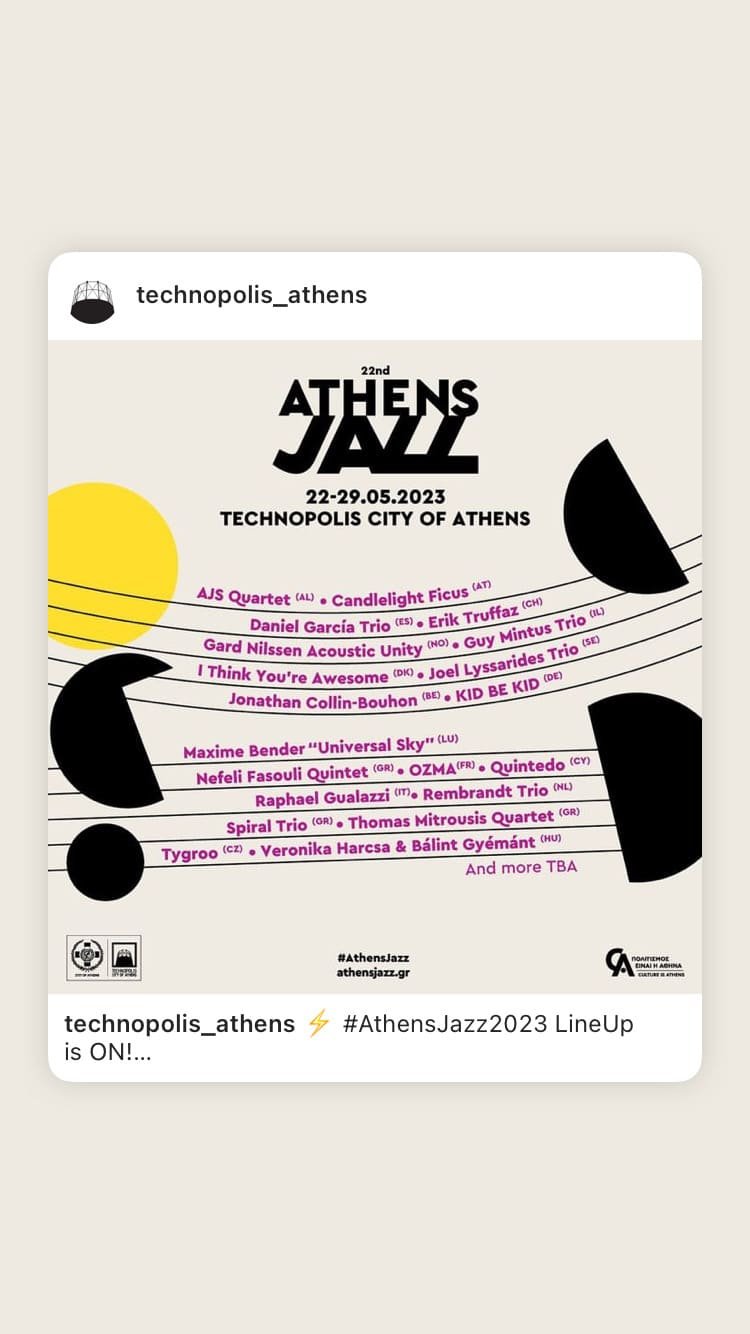 Estimated May 25–June 1 (Mon–Mon, late-May/early-June 7-day pattern based on 2025's May 26–June 1); first lineup wave expected Q1 2026 via athensjazz.gr/socials (@athensjazz)—building on 2025's 21 acts from 19 countries like Yiorgos Bereris Trio (Nordic-Cuban-Balkan fusion), Modified Dog (jazz+), Valia Calda (Greek official entry), Phønix (Norway), Mohs (Switzerland), and Toot Ensemble (Czech), anticipate 50+ diverse sets blending bebop, afrobeat, electronic, and punk energy. Full reveal April; presale for workshops March. Download brochure/map via athensjazz.gr for past vibes.