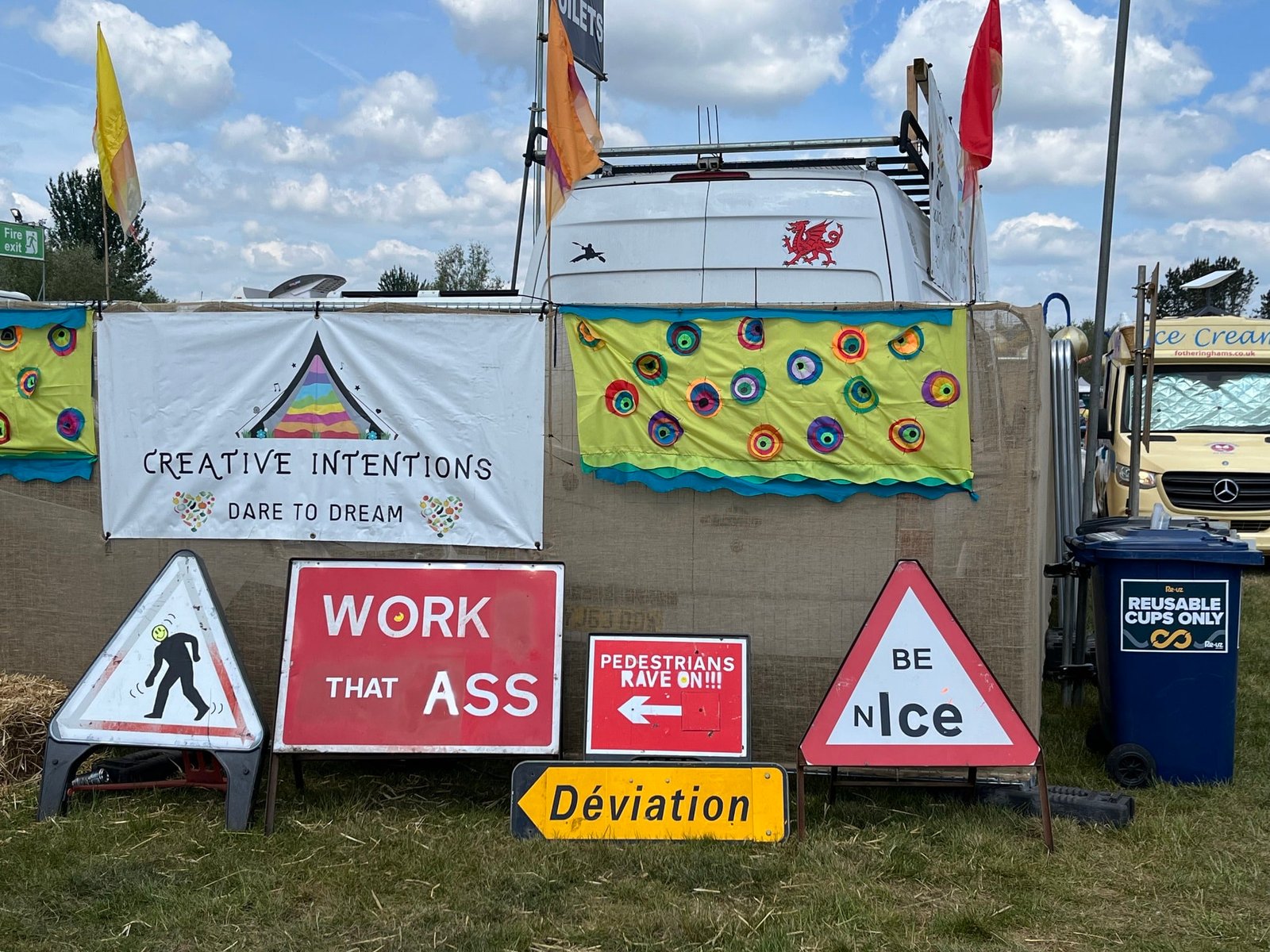Sustainability includes HVO fuel (90% CO2 reduction), local borehole water, composting toilets, and reusable cups ($5 USD, refundable). The 8th Plate initiative donates surplus food to foodbanks. Over 30 stalls offer organic vegan, vegetarian, and gluten-free options (e.g., Jamaican jerk wraps, $10 USD); allergen menus via app; picnics allowed (no glass). Attendees can offset travel carbon via Onboard: Earth or cycle for a free meal token.