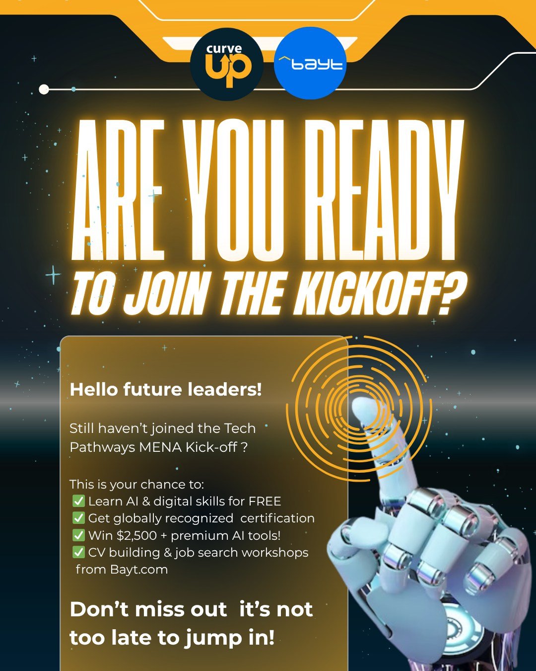 - Special Seating/VIP Options: Premium options include reserved workshop spots, one-on-one mentor sessions, and priority project pitching; team bundles available.