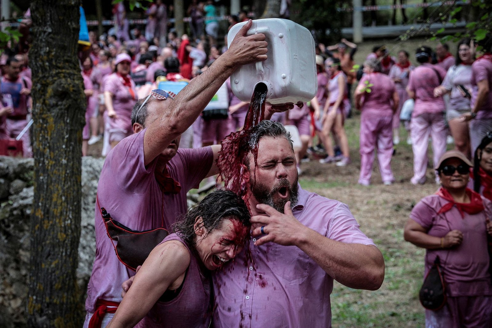La Batalla del Vino is a traditional Spanish festival where thousands of people climb a mountain to throw liters of red wine at each other. It takes place on St. Peter’s Day and transforms the participants’ white clothing into a uniform purple hue.
