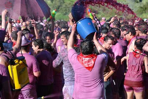 The battle takes place at the Riscos de Bilibio, which is approximately 4 miles away from the center of Haro. On the morning of June 29, the local government provides a frequent shuttle bus service that departs from the area near the Tirón river bridge starting very early in the morning. Many people choose to take the shuttle up and then walk back down to town later in the morning to enjoy the scenery of the surrounding vineyards.