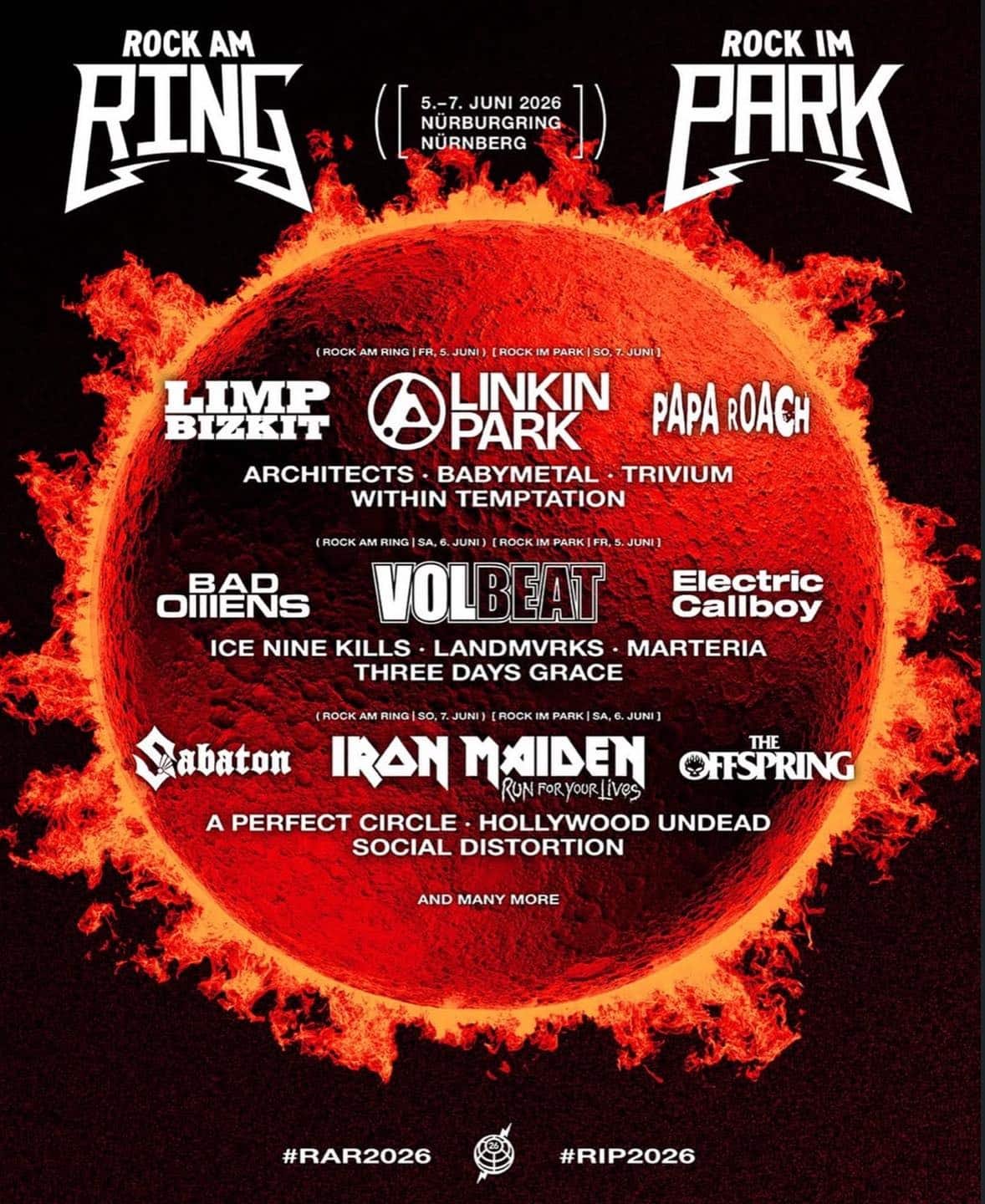 June 5–7, 2026, at Nürburgring. Friday: Limp Bizkit, Linkin Park, Papa Roach, Architects, Babymetal, Trivium, Within Temptation. Saturday: Bad Omens, Volbeat, Electric Callboy, Ice Nine Kills, Landmvrks, Marteria, Three Days Grace. Sunday: Sabaton, Iron Maiden, The Offspring, A Perfect Circle, Hollywood Undead, Social Distortion. 90,000 capacity; app for schedules. Camping opens June 3; mild Eifel summer—pack rain gear.