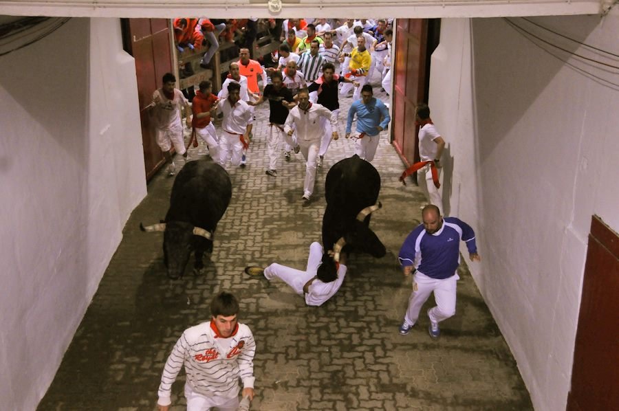 - Main Attractions: The daily encierro at 8:00 AM (July 7–14) sees runners race 848 meters ahead of six fighting bulls and six steers from the Santo Domingo corral through Pamplona’s Old Town to the Plaza de Toros. Bullfights follow at 6:30 PM, with the July 6 Rejones bullfight featuring a matador on horseback. Over 400 events include nightly fireworks, concerts, street performances, and traditional sports like wood-chopping competitions.